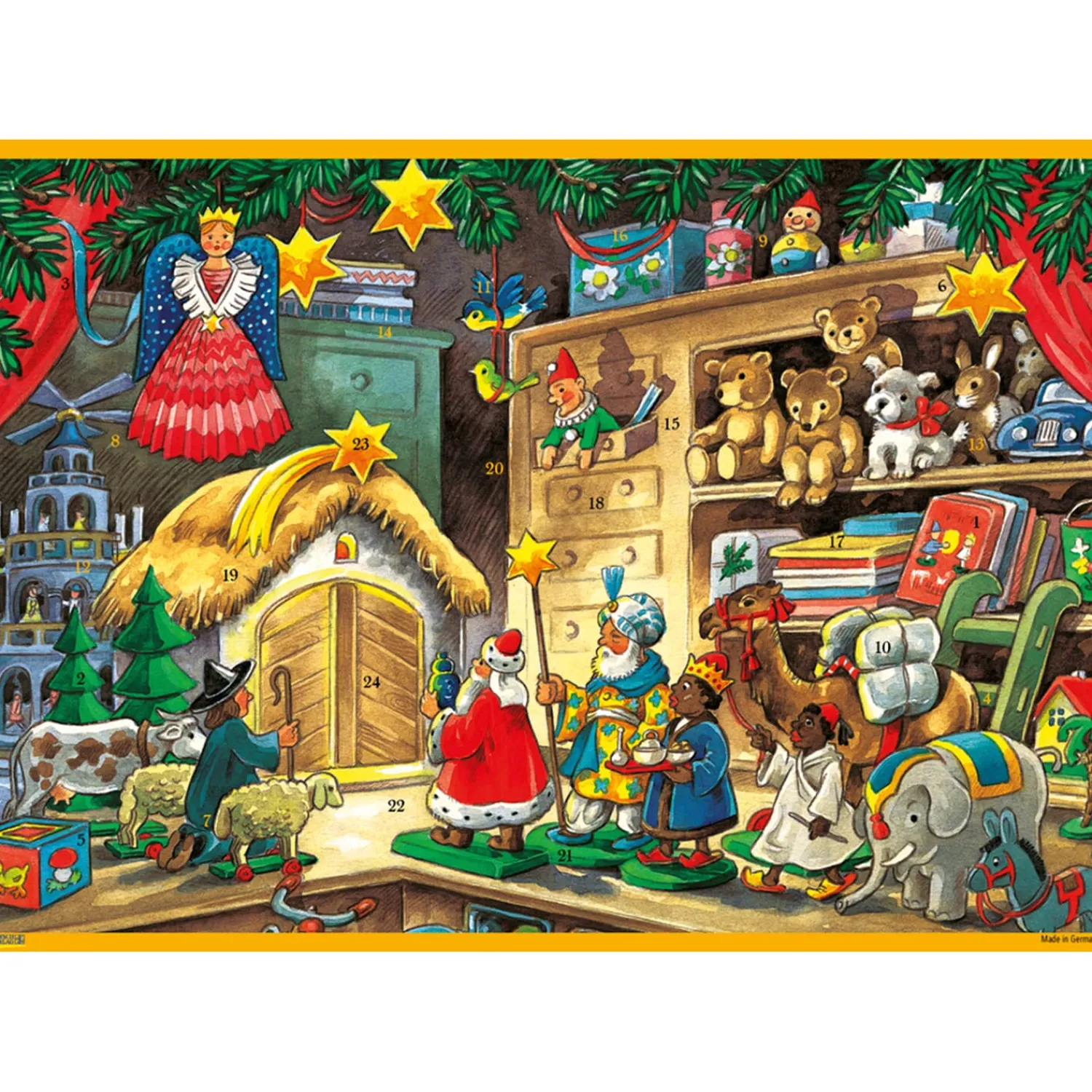 Ein besonders reich illustrierter Papier-Adventskalender mit Glitzereffekt – perfekt für Sammler und Nostalgiker.