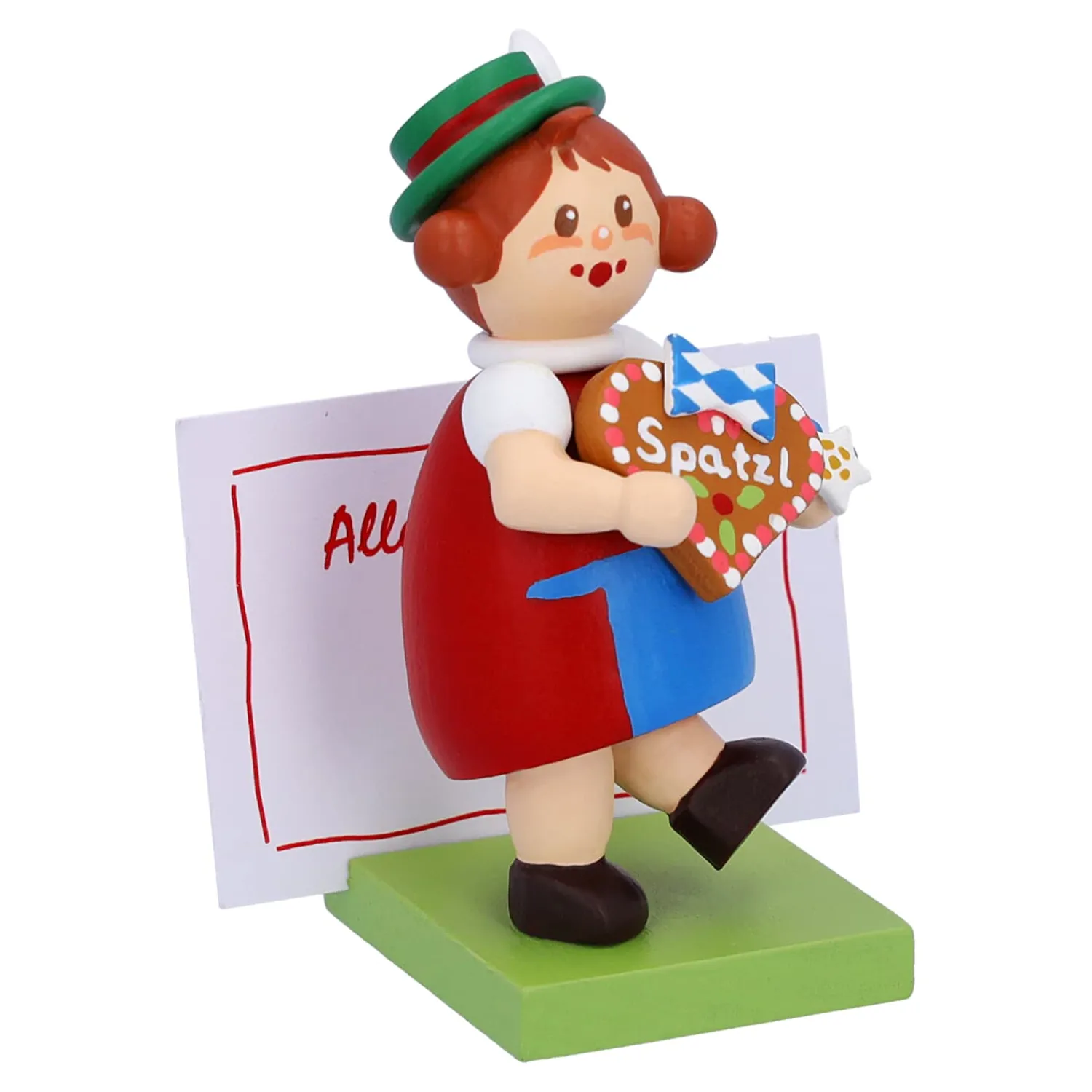 Das niedliche Mädchen aus Bayern in Dirndl hält ein großes Lebkuchenherz in Händen. Darauf ist mit Zuckerschrift „Spatzl“ geschrieben. Einem typischen bayerischen Kosenamen für einen geliebten Menschen. Auf dem Sockel können Sie Ihre persönliche Botschaft platzieren. Die passenden Zettel bringt die hübsche Bayerin gleich mit.