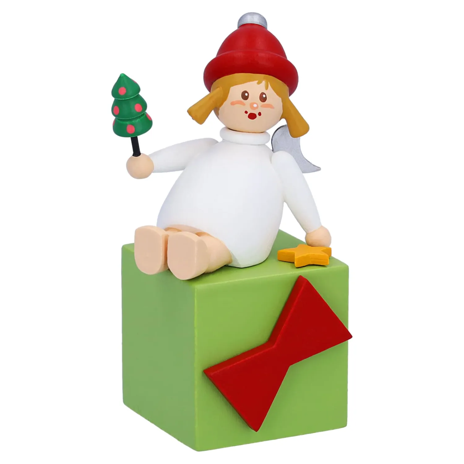 Das Geschenk des Engelchens ist so groß, dass es sogar drauf sitzen kann. Auf dem Kopf trägt der kleine Engel eine rote Bommelmütze. In der Hand hält es einen kleinen Weihnachtsbaum.