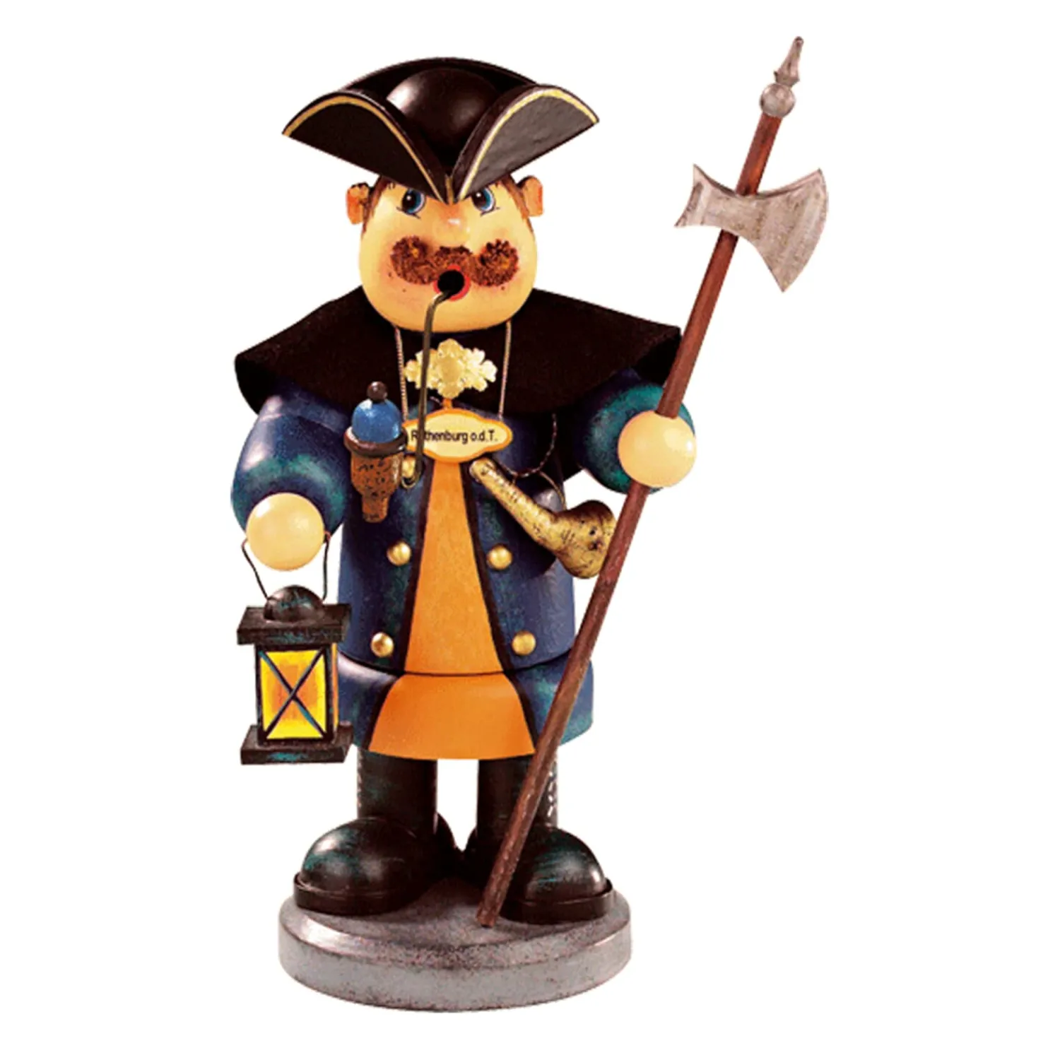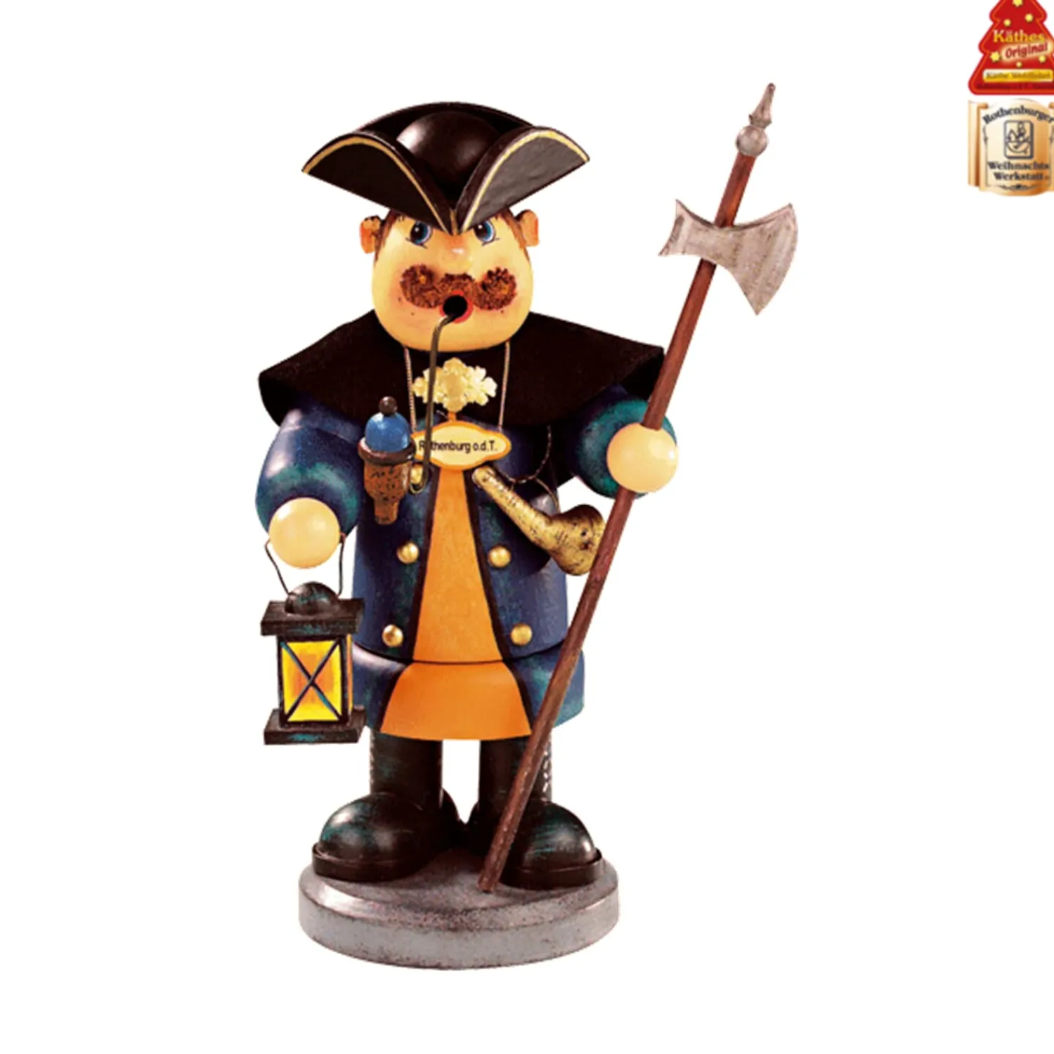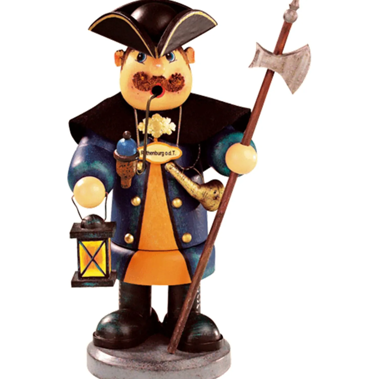Der charmante Nachtwächter im traditionellen Gewand mit Hut, Laterne, Horn und Hellebarde ist ein wunderschönes Erinnerungsstück von einem Aufenthalt in Rothenburg ob der Tauber! Aus seiner Pfeife strömt ein wunderbarer Räucherdurft durch die Gassen der Altstadt. Ganz wie sein großes Vorbild, der Rothenburger Nachtwächter, wird unser Holzknoddl auch Ihr Zuhause erhellen. Eine zeitlose Dekoration aber auch ein schönes Andenken an eine Reise nach Rothenburg.