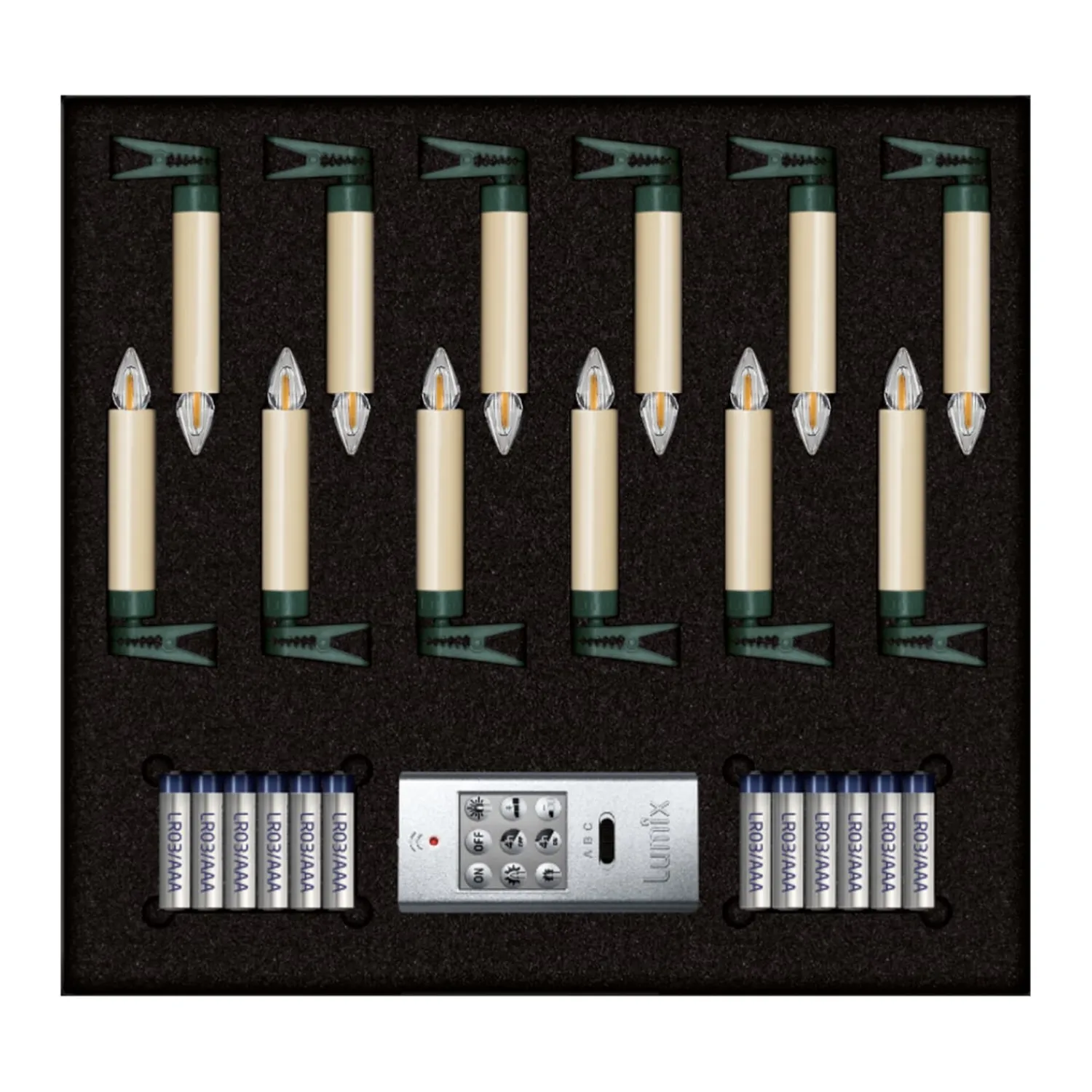 - 12 Mini LED Kerzen inklusive 12 Alkaline Qualitäts-Batterien (Typ LR03/AAA)