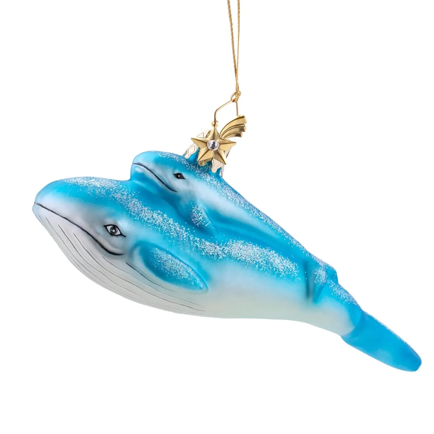 Der Blauwal, ein sanfter Riese der Meere, gleitet majestätisch durch die tiefen Gewässer, begleitet von seinem neugeborenen Kalb. Ihre massigen, bläulichen Körper schneiden elegant durch das glitzernde Wasser, während sie eine Aura der Ruhe und Erhabenheit ausstrahlen. Ein eindrucksvolles Bild der Natur, das die unendliche Schönheit des Ozeans zelebriert. Dieses eindrucksvolle Naturschauspiel haben wir in einem Artikel aus der Poesie in Glas Kollektion nachempfunden. Mundgeblasen und von Hand bemalt, fängt dieser Glas-Baumbehang die Schönheit und Harmonie des Blauwals ein – ein wunderbares Symbol für den Schutz unserer bedrohten Tierwelt.