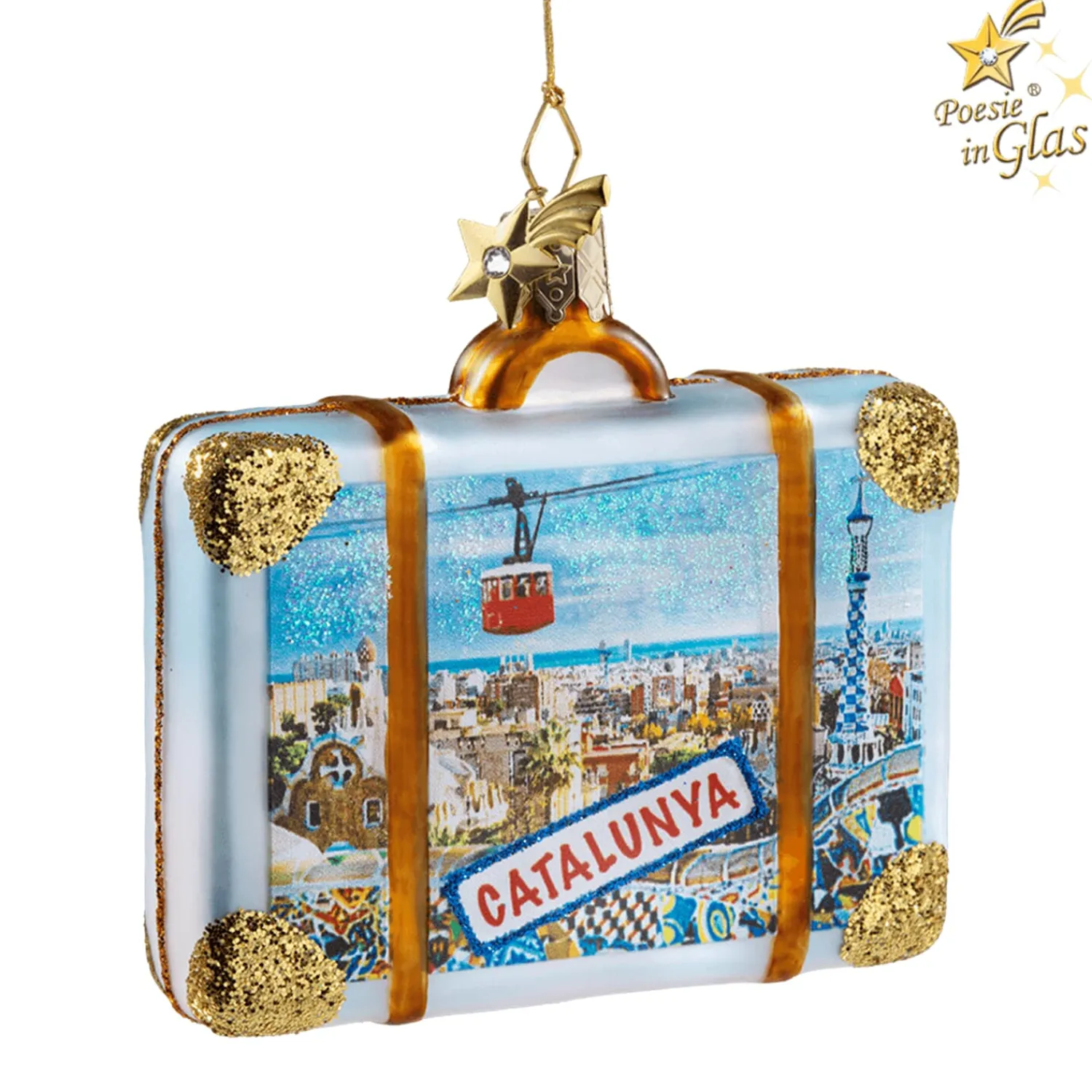 Hübsches Köfferchen mit den Sehenswürdigkeiten von Barcelona! Abgebildet sind u. a. die berühmte Kathedrale „La Sagrada Familia“, die Standseilbahn und der Mosaik-Salamander des Parks Güell. Von hier aus hat man auch einen herrlichen Blick über die Stadt bis zum Meer.