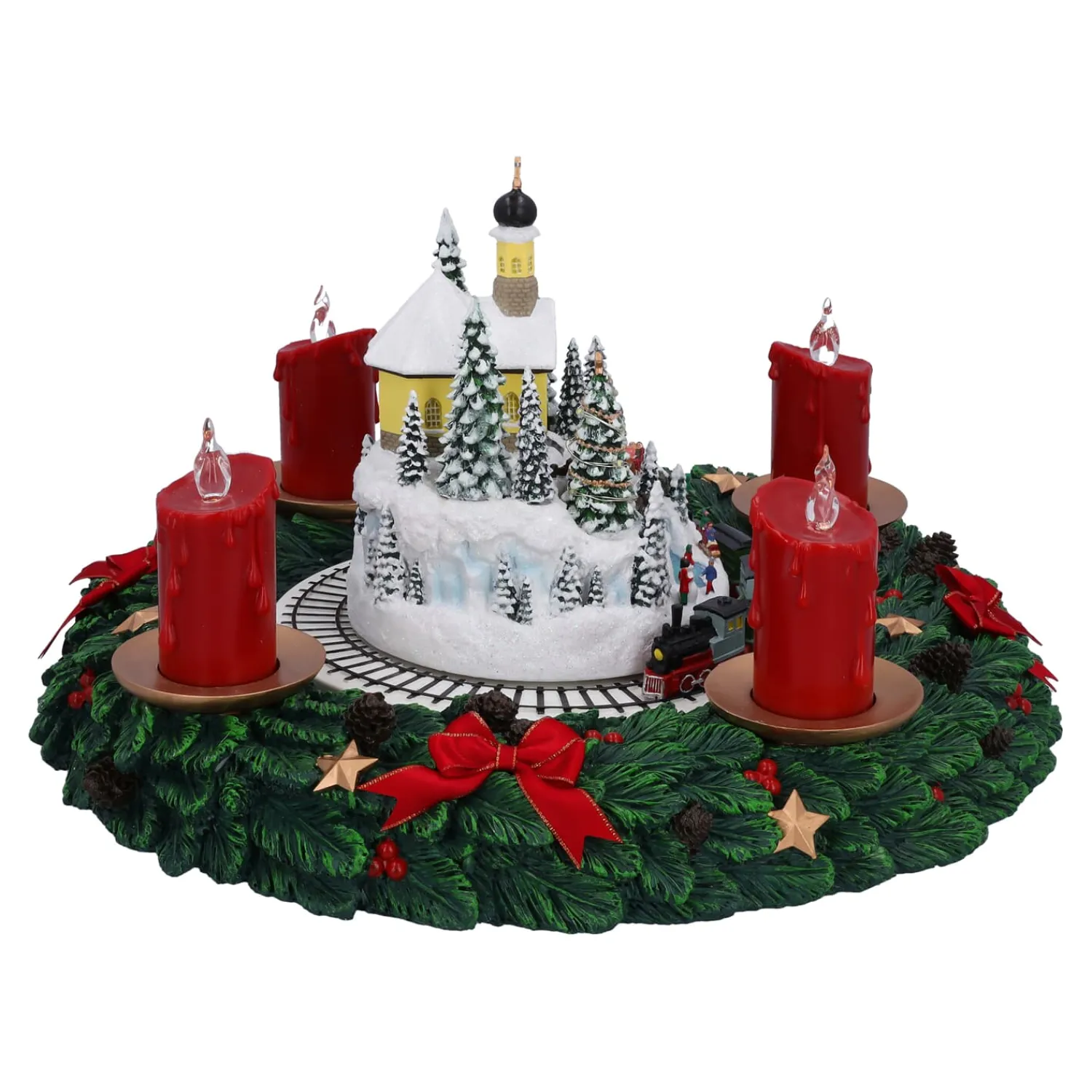 Dieser bezaubernde Adventskranz sorgt nicht nur für eine stimmungsvolle Beleuchtung, sondern begeistert auch mit Musik und Bewegung! Die vier Kerzen lassen sich einzeln anmachen, sodass Sie den Kranz wie einen traditionellen Adventskranz nutzen können – für jeden Adventssonntag eine Kerze mehr. In der Mitte befindet sich ein malerisches Winterdorf mit einer Kirche und verschneiten Bäumen. Während eine kleine Eisenbahn fröhlich ihre Runden um das Dorf dreht, können Sie den festlichen Melodien des integrierten Spielwerks lauschen.