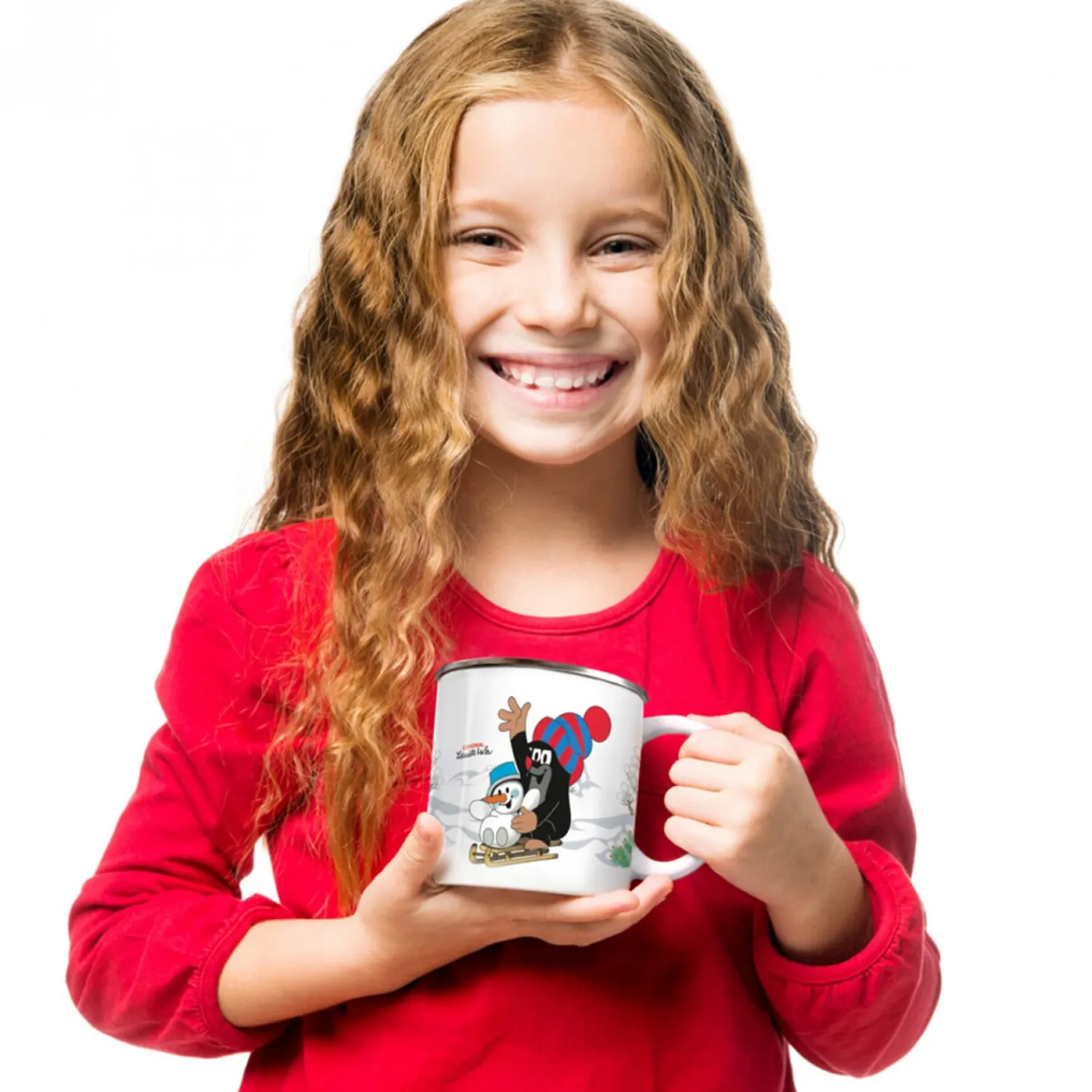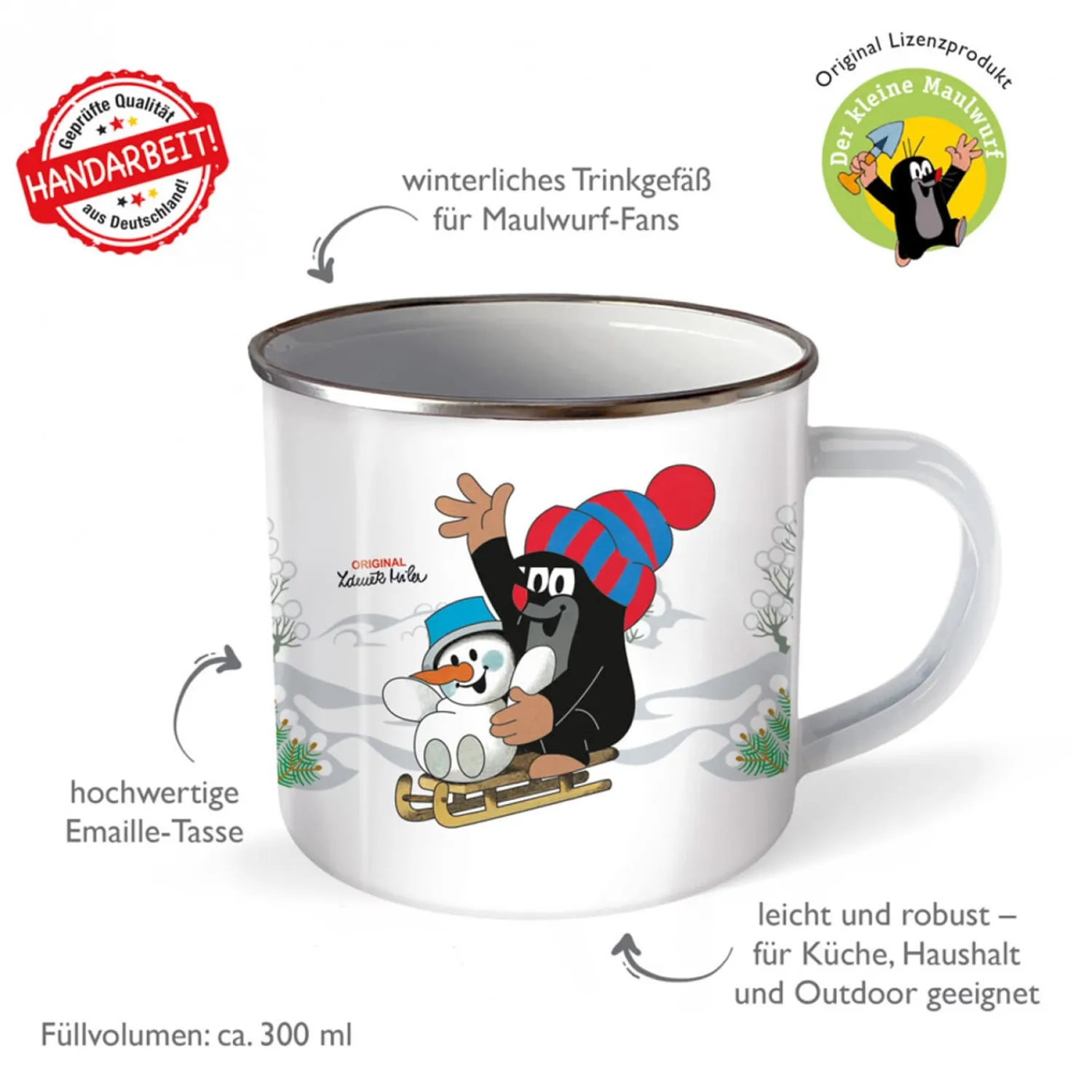 Die schön gestaltete Emailletasse mit dem Maulwurf versüßt jedes Kalt- oder Heißgetränk.