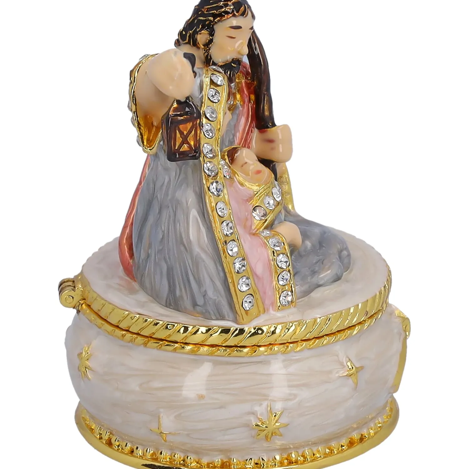 Diese kunstvoll gestaltete Schatulle zeigt die Heilige Familie in inniger Verbundenheit. Maria und Josef blicken liebevoll auf das neugeborene Jesuskind, umrahmt von funkelnden Akzenten und feinen Verzierungen. Ein strahlender Stern weist den Weg und unterstreicht die besondere Bedeutung dieser Szene. Doch nicht nur ihre symbolische Kraft macht diese Krippe so besonders – sie verbirgt zudem ein kleines Geheimnis: Als Schatulle bewahrt sie kleine Kostbarkeiten sicher auf. Ein stilvolles Sammlerstück und ein wunderschönes Geschenk, das die wahre Bedeutung von Weihnachten in Ihr Zuhause bringt.