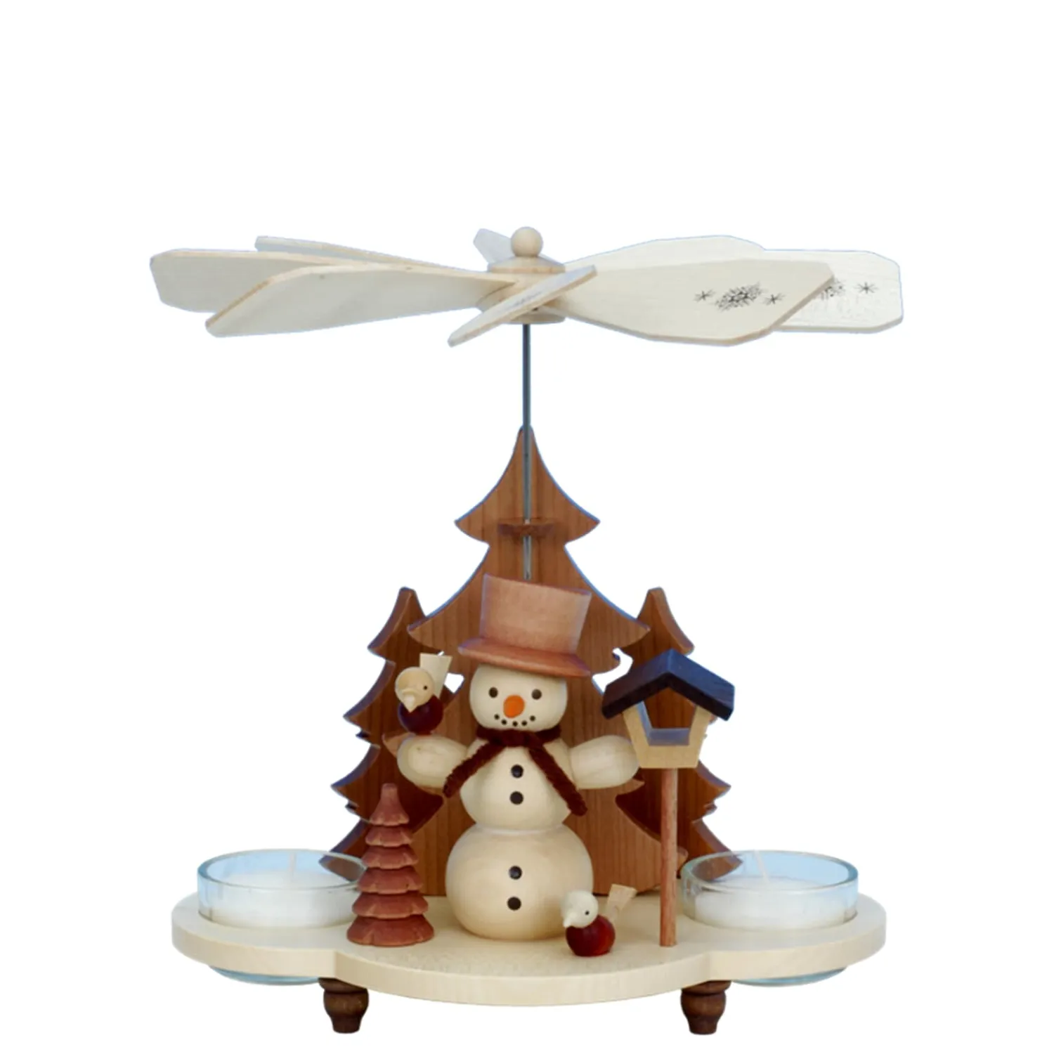 Eine der schönsten Weihnachtstraditionen sind Pyramiden und die Geschichten die sie erzählen. Das durch Kerzenwärme angetriebene Flügelrad zaubert ein wunderbares Spiel aus Licht und Schatten an Decken und Wände.