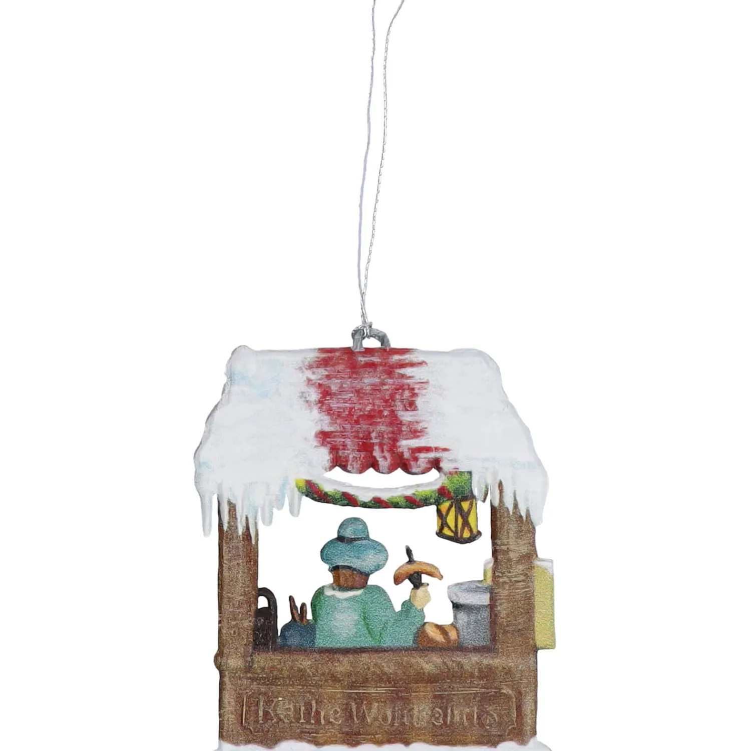 Der „Bratwurststand“ Zinn-Baumbehang erinnert an die gemütliche Atmosphäre eines traditionellen Weihnachtsmarkts. Unter einem verschneiten Dach steht ein festlich geschmückter Stand, an dem eine fröhliche Verkäuferin ihre Spezialität anbietet – ein Motiv, das den Zauber und die Geselligkeit der Adventszeit lebendig werden lässt.