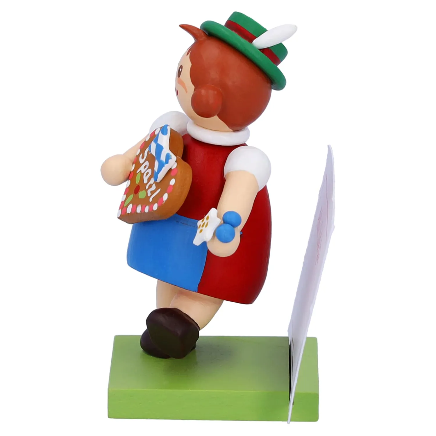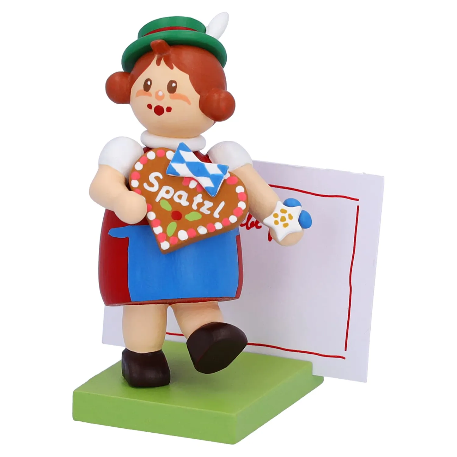 Das niedliche Mädchen aus Bayern in Dirndl hält ein großes Lebkuchenherz in Händen. Darauf ist mit Zuckerschrift „Spatzl“ geschrieben. Einem typischen bayerischen Kosenamen für einen geliebten Menschen. Auf dem Sockel können Sie Ihre persönliche Botschaft platzieren. Die passenden Zettel bringt die hübsche Bayerin gleich mit.