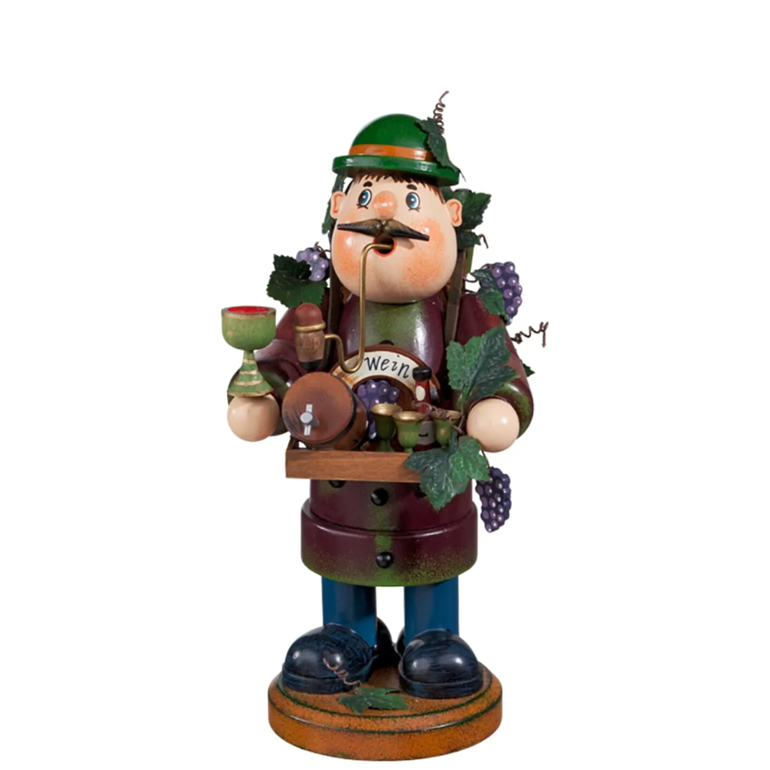 Der knuffige Weinhändler lädt Sie gerne auf einen Schoppen ein. In seinem Bauchladen preist er seinen besten Rotwein oder den würzigen Weißwein feil. Auch ein kleines Weinfass ist zu sehen. Wer sich diesen Händler nach Hause holt, wird gewiss stets einen guten Tropfen im Haus haben. Unser Holzknoddl ist außerdem mit blauen Trauben verziert und aus seiner Pfeife strömt ein wunderbarer Räucherdurft. Ein schönes Mitbringsel von einer Weinprobe, tolle Geschenkidee für jeden Weinliebhaber oder als Dreingabe zu einer guten Flasche Wein.
