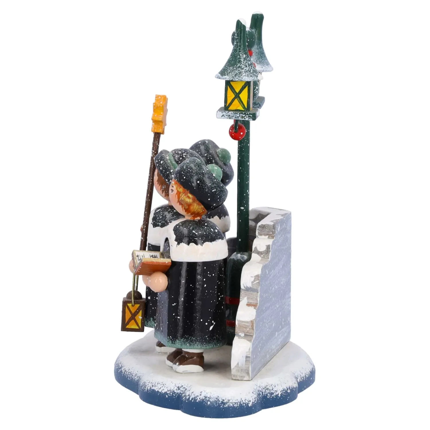 Ein schöner Anblick in Ihrem kleinen Winterdorf sind die Kinder der Kurrende. Auch an kalten Winterabenden stehen sie in der Adventszeit im Laternenlicht und erfreuen die Leute auf den Straßen mit den schönsten Weihnachtsliedern. Die kleinen Sänger sind in die klassischen schwarzen Umhänge gehüllt und tragen runde schwarze Kopfbedeckungen. Der Junge in der Mitte trägt traditionell einen Sternenstab und seine Laterne leuchtet mit warmem Licht. Die singenden Mädchen an seiner Seite halten zudem ein Gesangsbuch in ihren Händen. Eine bezaubernde Szenerie in Ihrer Winterwelt!