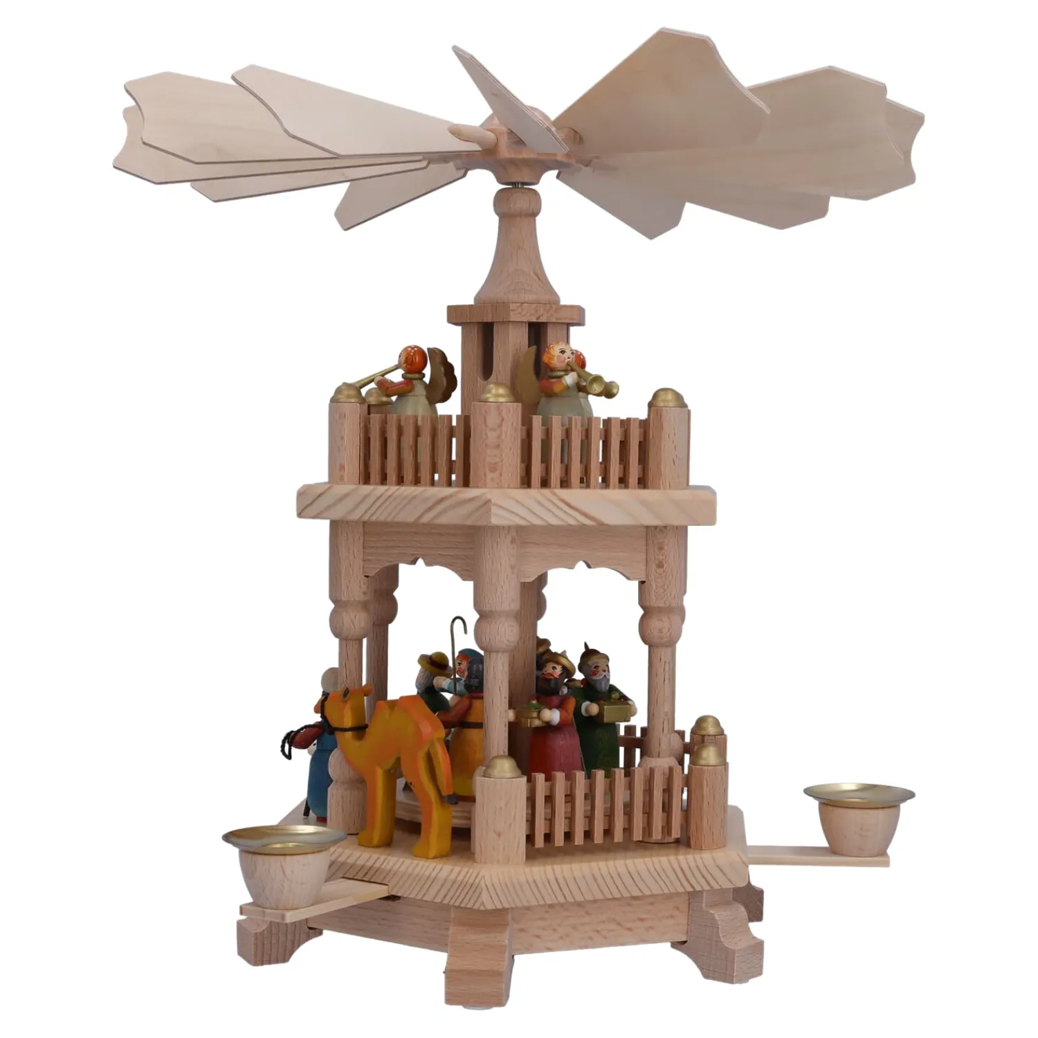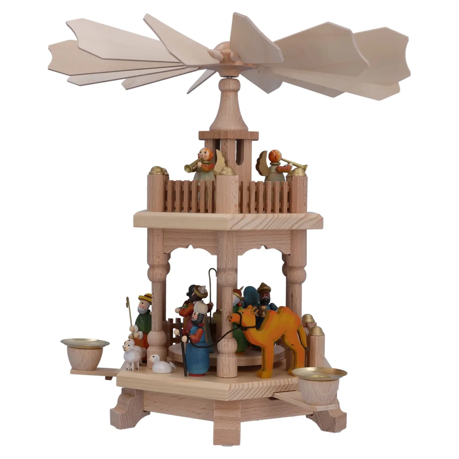 Eine der schönsten Weihnachtstraditionen aus dem Erzgebirge sind Pyramiden und die Geschichten die sie erzählen. Das durch Kerzenwärme angetriebene Flügelrad zaubert ein wunderbares Spiel aus Licht und Schatten an Decken und Wände.