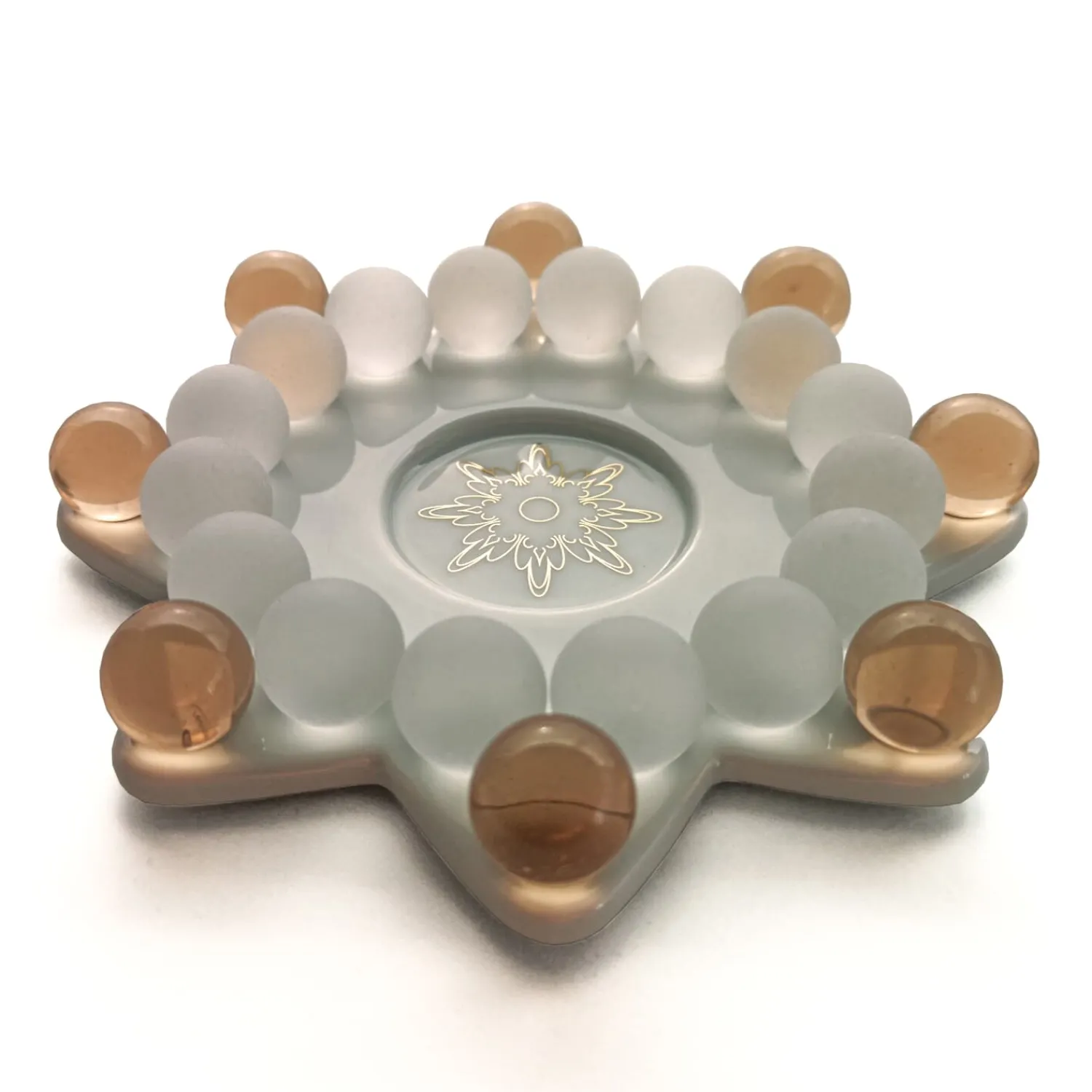 Hergestellt in Dresden, der Wiege der sächsischen Porzellankunst, besteht dieser besondere Teelichthalter aus feinstem Freiberger Porzellan mit edlem Echtgold-Dekor. Umgeben ist das Zentrum von 16 mattweißen Kristallglas-Perlen und acht farbintensiven Böhmischen Glasperlen – jede einzelne handgefertigt und sorgfältig eingesetzt.