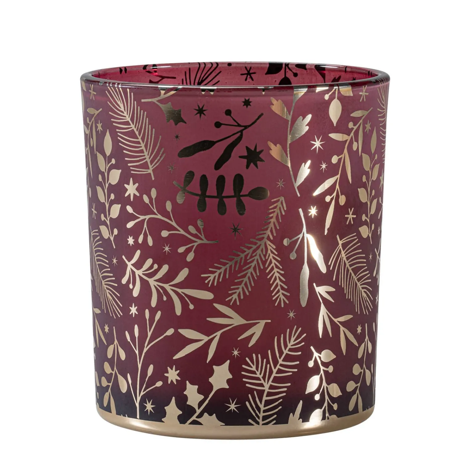 Dieses elegante Windlicht aus Glas bringt mit seinem filigranen Muster aus Weihnachtszweigen eine festliche Atmosphäre in Ihr Zuhause. Ob auf dem Tisch oder der Fensterbank – das warme Kerzenlicht zaubert durch das zarte Design ein gemütliches und festliches Ambiente, das perfekt in die Weihnachtszeit passt.
