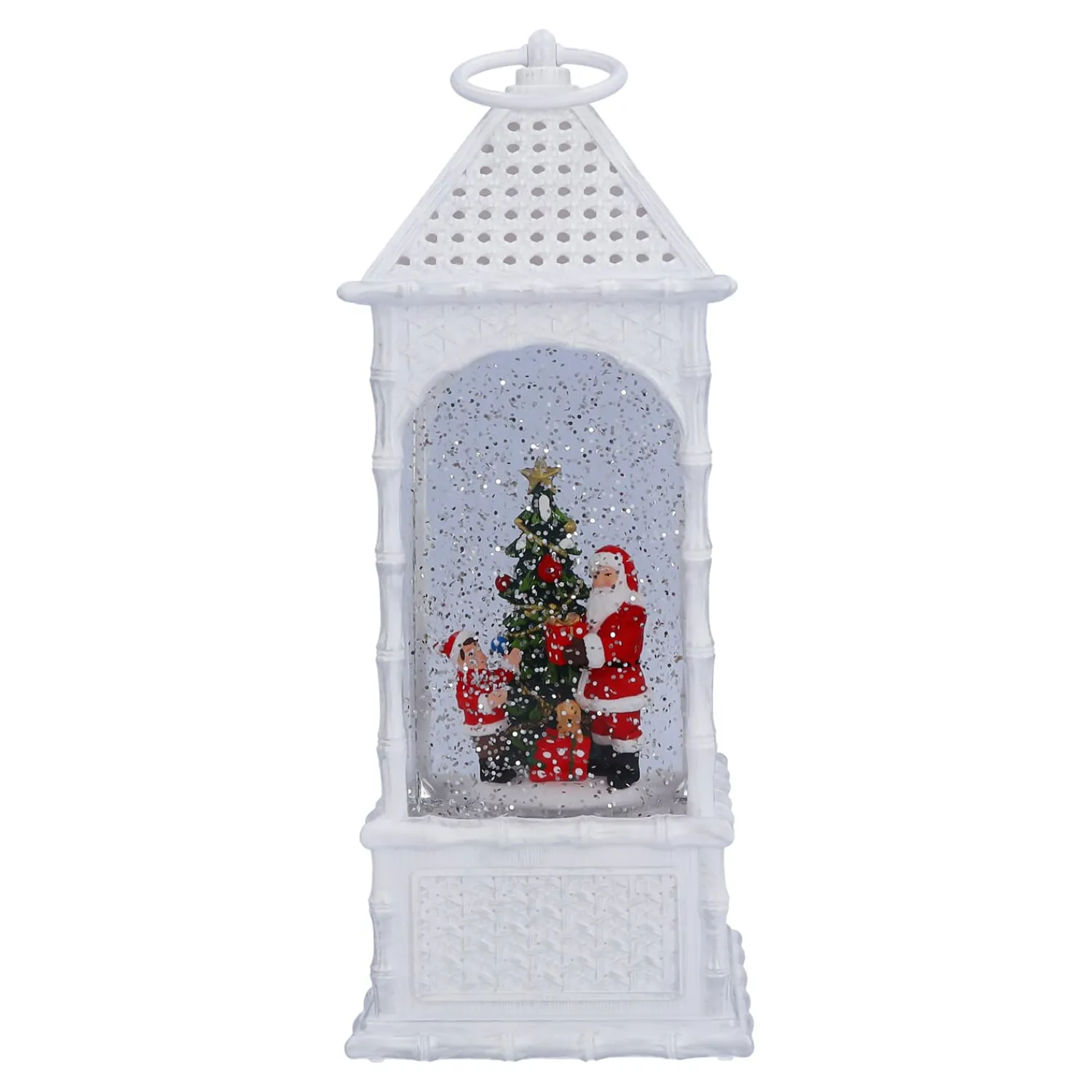 Diese wassergefüllte LED-Laterne aus Kunststoff und Plexiglas bringt mit ihrem automatischen Schneegestöber eine zauberhafte Winterwelt in Ihr Zuhause. In der funkelnden Schneelandschaft überreicht der Weihnachtsmann einem Kind ein Geschenk, während ein festlich geschmückter Baum die Szene erhellt. Die warmweiße LED-Beleuchtung und die sanft wirbelnden Schneeflocken machen diese Laterne zu einem wunderschönen Highlight für Ihre Weihnachtsdekoration, die festliche Magie verbreitet.