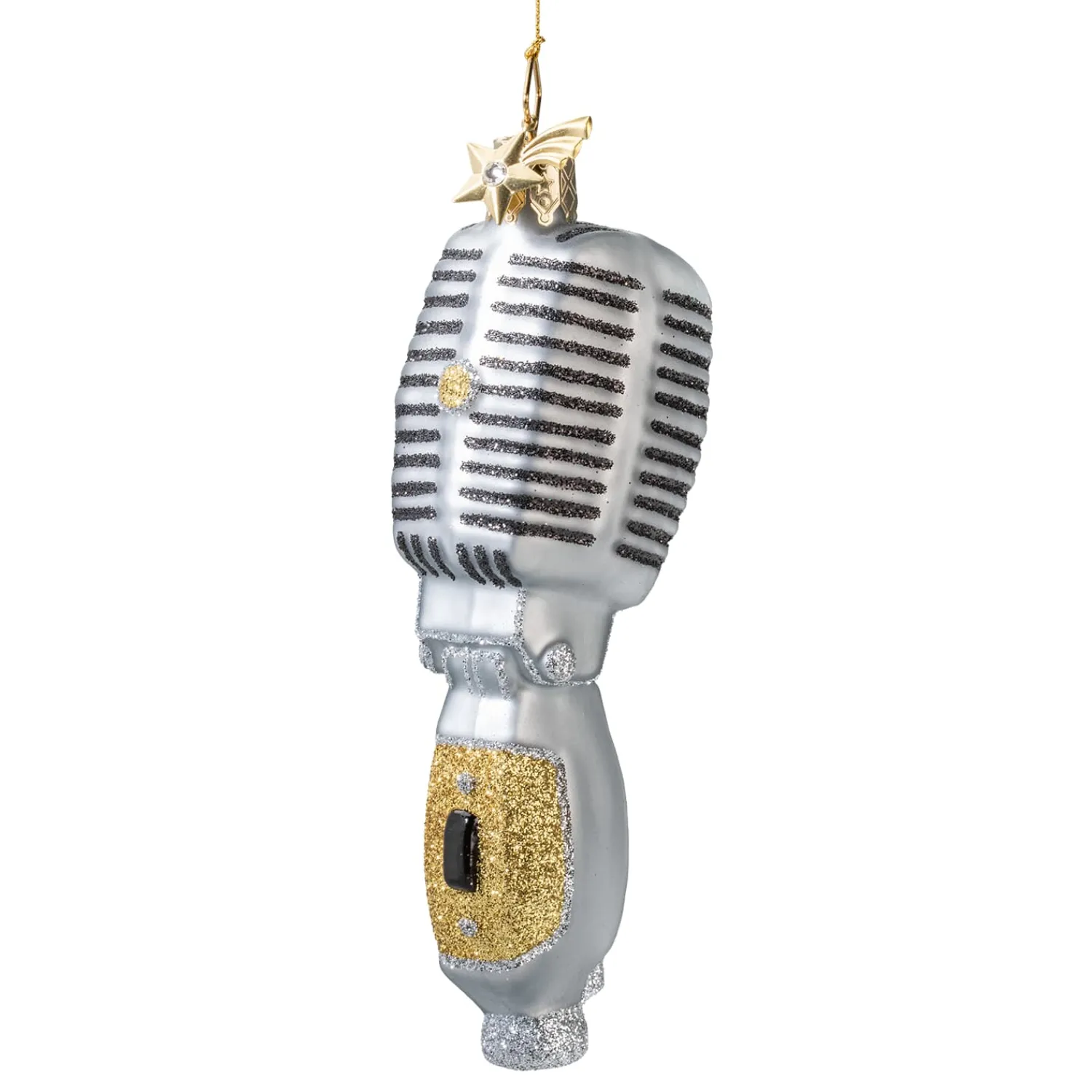 Silberfarben, mit funkelnden Glitzerakzenten und goldfarbenem Schimmer gestaltet, bringt dieses handbemalte und mundgeblasene Ornament eine stilvolle Note an den Weihnachtsbaum. Ein charmanter Glas-Baumbehang für alle, die Musik nicht nur hören, sondern mit ganzem Herzen spüren.
