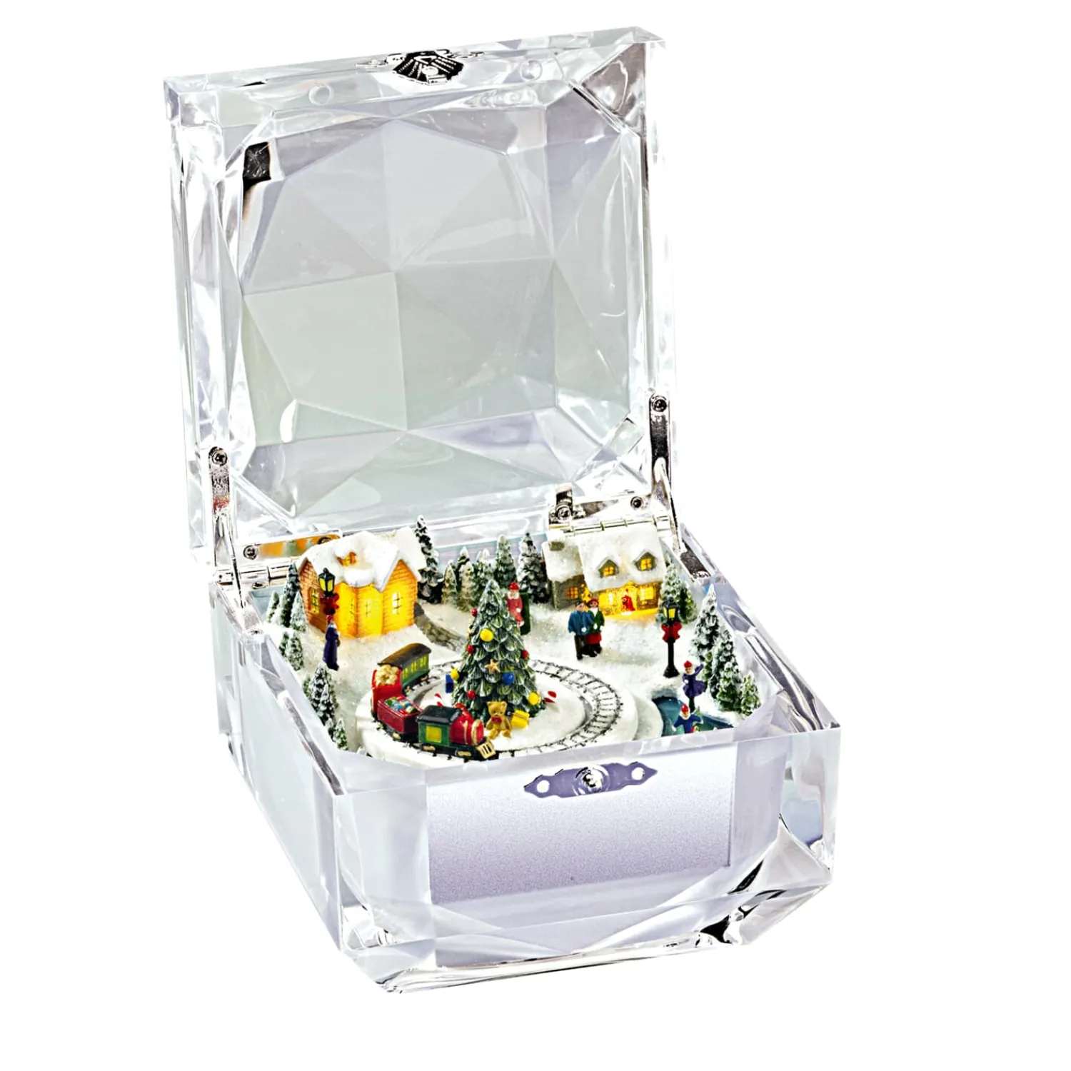 Wie ein Fenster in eine zauberhafte Weihnachtswelt öffnet sich diese Musikdose und enthüllt ein liebevoll gestaltetes Winterdorf. Kinder schlendern durch den Schnee, vorbei an schneebedeckten Häusern, während ein kleiner Zug behutsam seine Kreise um einen festlich geschmückten Tannenbaum zieht. Begleitet von acht klassischen Weihnachtsmelodien entfaltet sich eine Szenerie – und mit ihr ein Hauch von Winterzauber, der Herz und Sinne berührt.