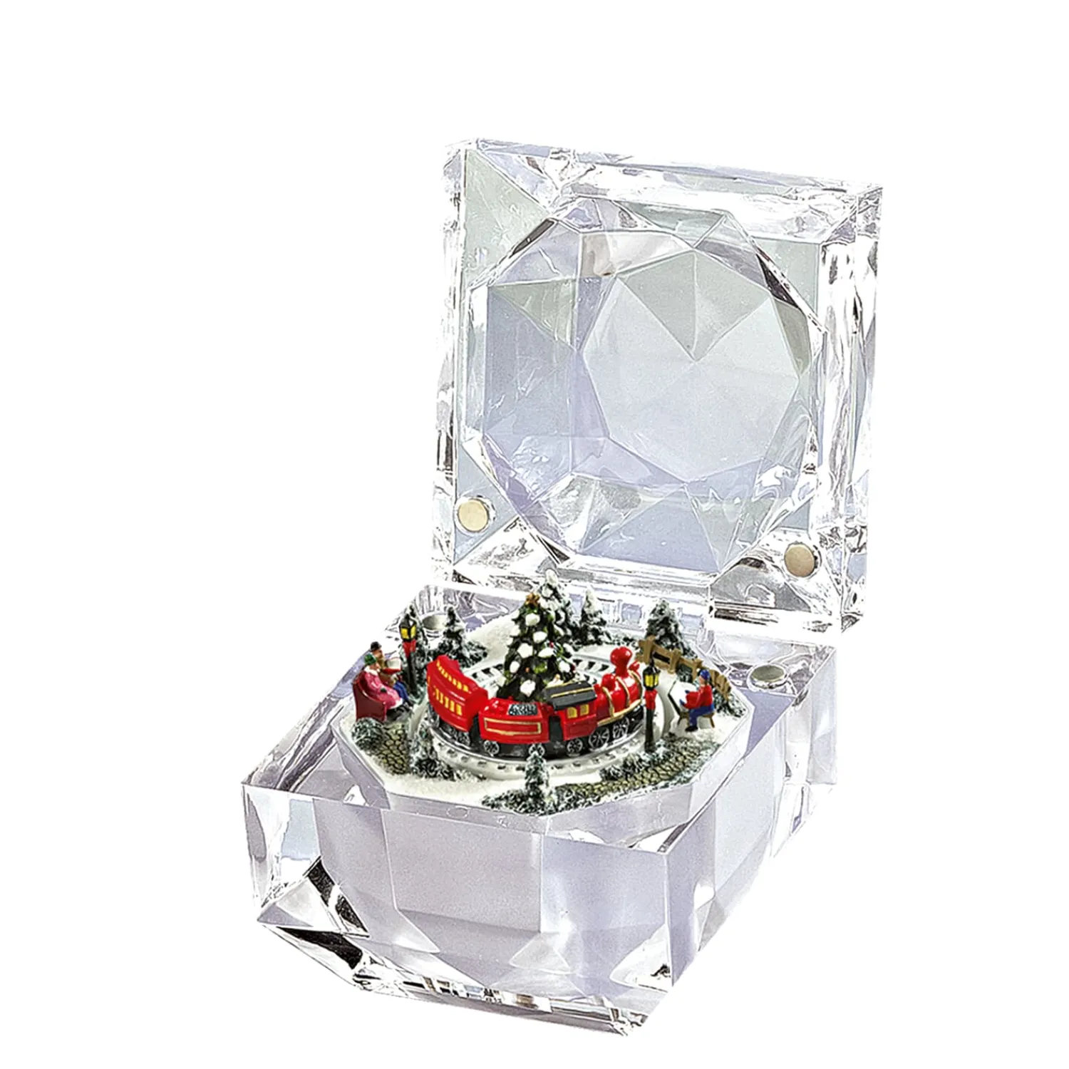 Wie ein kostbarer Kristall öffnet sich diese Musikdose und offenbart eine liebevoll gestaltete Winterwelt im Miniaturformat. Inmitten der glitzernden Landschaft dreht sich eine rote Eisenbahn um einen verschneiten Baum – begleitet von der bekannten Melodie „We wish you a Merry Christmas“. Gefertigt aus transparentem Acryl und detailreichem Kunstharz, lässt diese Szene das Licht tanzen und schafft eine Atmosphäre voller Zauber und Nostalgie.