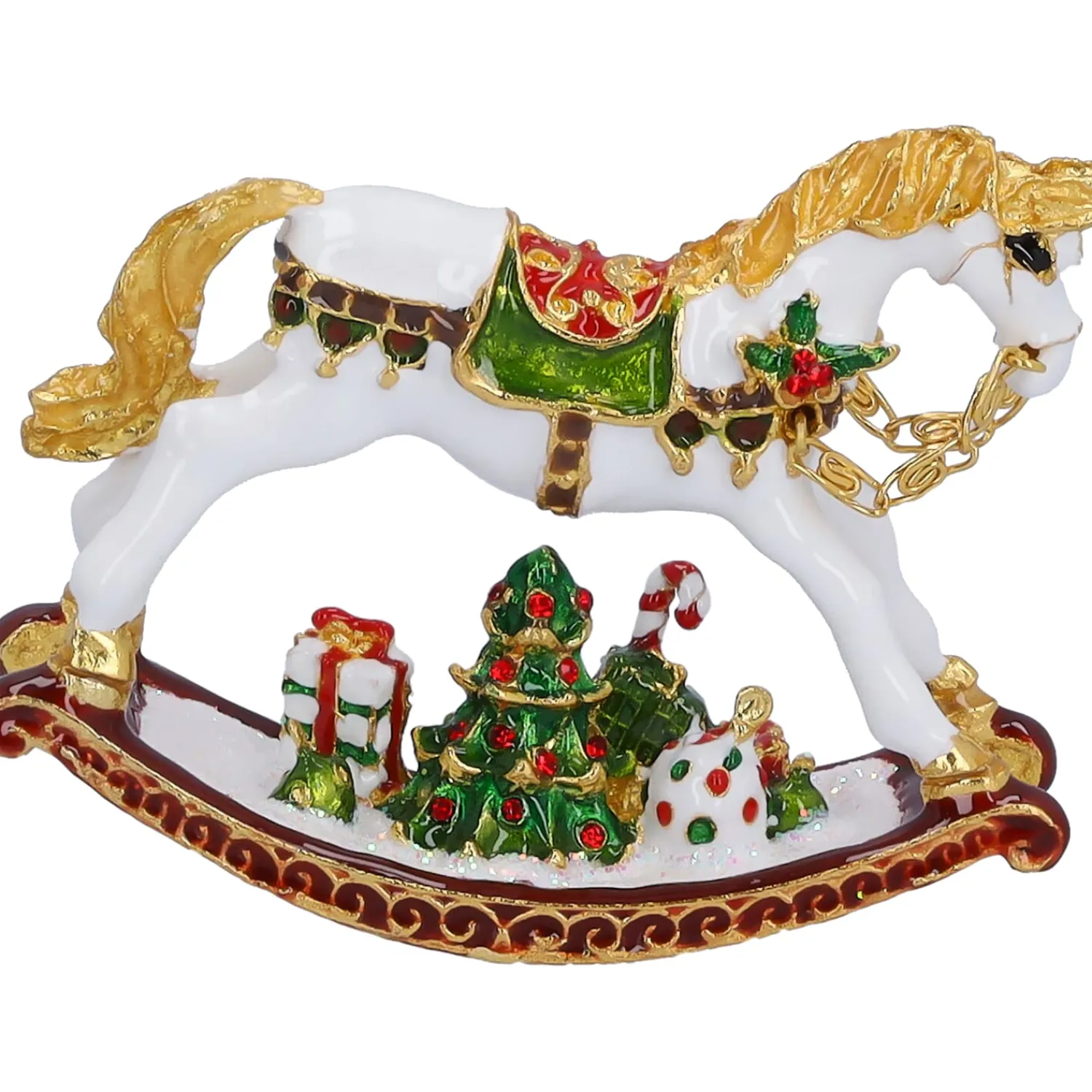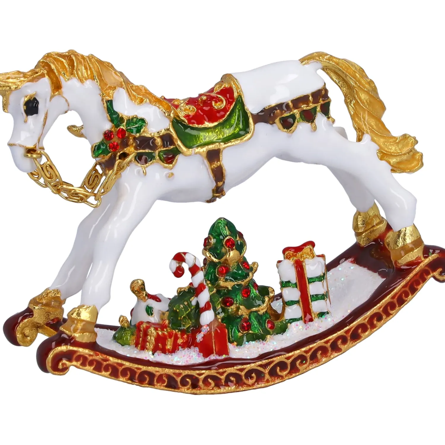 Dieses stilvolle Schaukelpferd entführt Sie in eine weihnachtliche Märchenwelt. Mit kunstvoll verzierten Akzenten, festlichem Zaumzeug und einem Weihnachtsbäumchen mit Geschenken versprüht es den Charme vergangener Kindheitstage. Ob als edle Sammlerfigur oder als besonderes Geschenk – dieses detailreiche Deko-Highlight lässt den Weihnachtszauber lebendig werden und bringt nostalgische Erinnerungen in Ihr Zuhause.