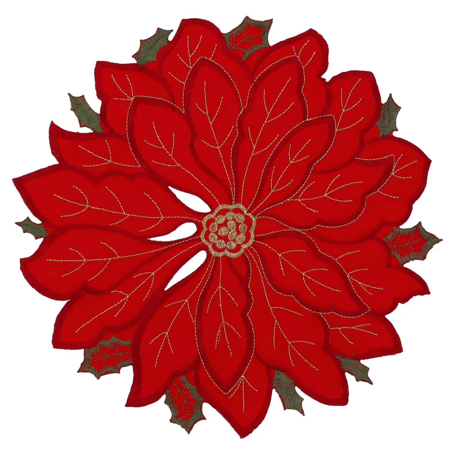 Dieser festliche Tischaufleger in leuchtendem Rot bringt die Schönheit des Weihnachtssterns direkt auf Ihren Tisch. Die Blütenform ist kunstvoll aus Polyester gefertigt und mit feinen goldfarbenen Stickereien durchzogen – ein strahlender Blickfang für Ihre Winterdekoration. Ob als Mittelpunkt auf dem Esstisch, als stimmungsvolles Highlight auf der Kommode oder als Unterlage für weihnachtliche Arrangements – dieser Aufleger verleiht jedem Raum eine festliche und elegante Note. Ideal für alle, die Weihnachten mit Stil und Herz zelebrieren.