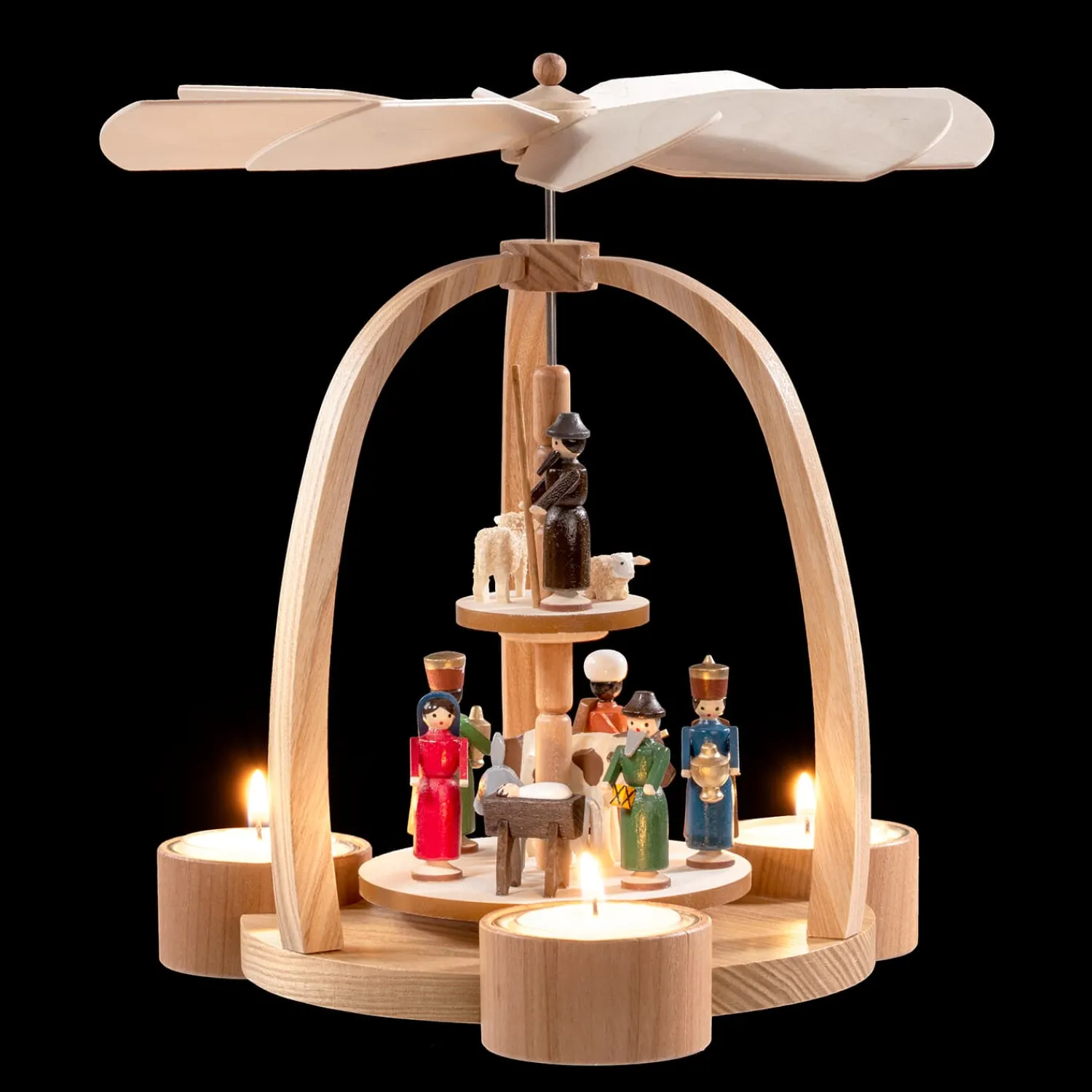 Eine der schönsten Weihnachtstraditionen sind Pyramiden und die Geschichten die sie erzählen. Das durch Kerzenwärme angetriebene Flügelrad zaubert ein wunderbares Spiel aus Licht und Schatten an Decken und Wände.