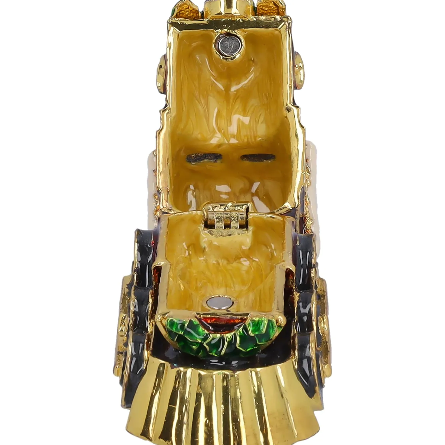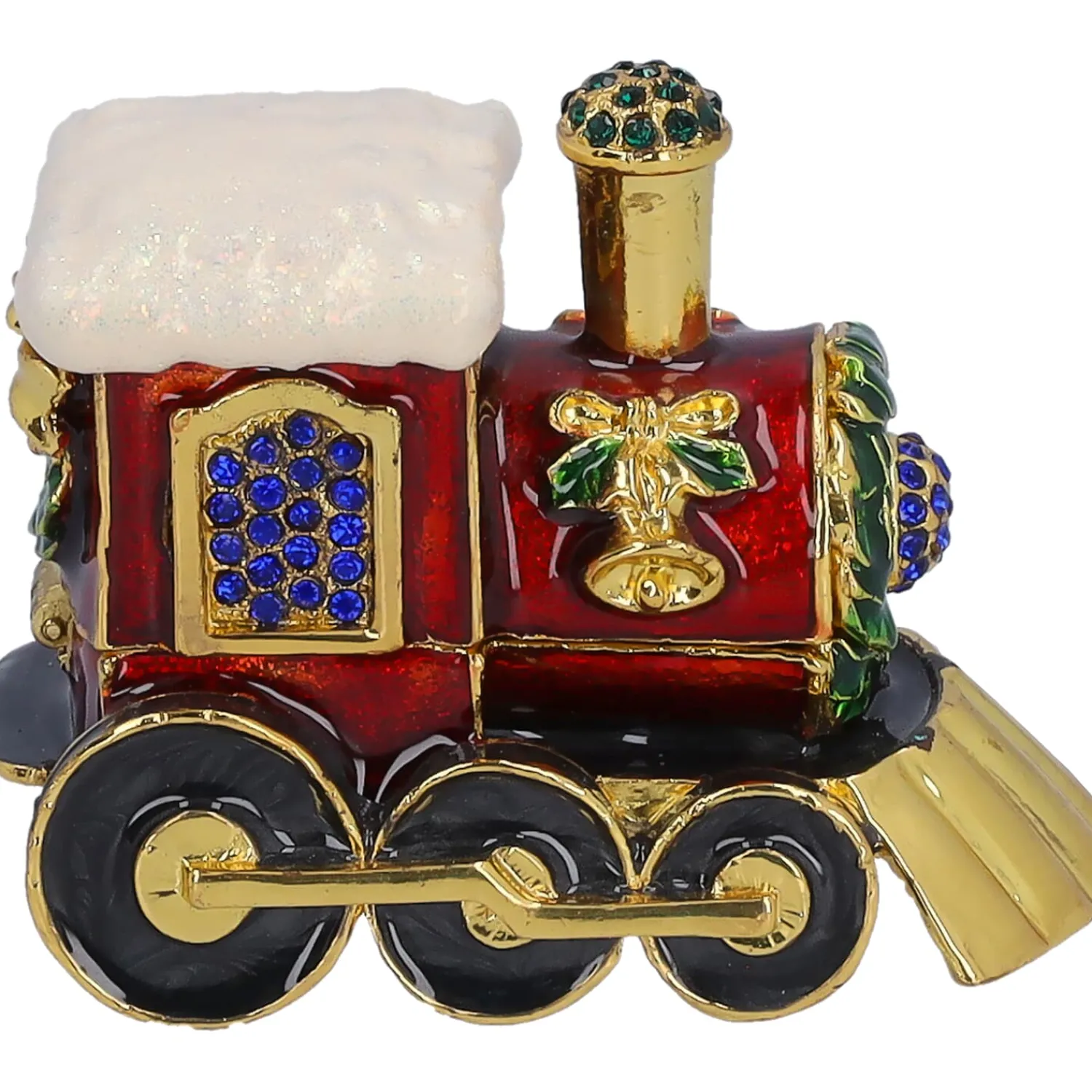 Diese kunstvoll gestaltete Lokomotive ist mehr als nur ein dekorativer Hingucker – sie ist eine bezaubernde Schatulle, die kleine Schätze stilvoll bewahrt. Mit glänzenden Goldakzenten, funkelnden Schmucksteinen und einem schimmernden Schneedach versprüht sie nostalgischen Weihnachtszauber und erinnert an gemütliche Fahrten durch verschneite Winterlandschaften. Eine perfekte Geschenkidee für Eisenbahnliebhaber!