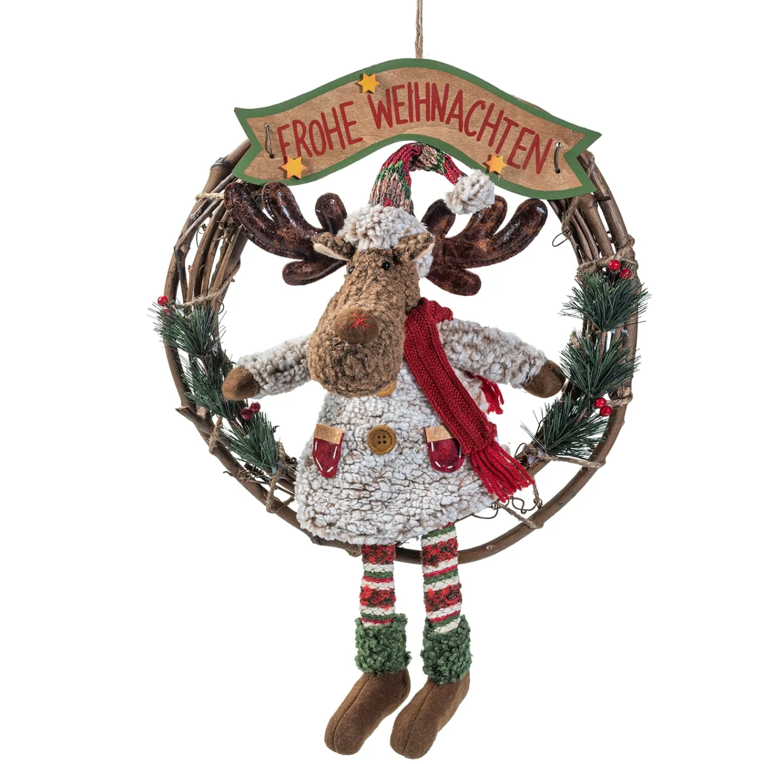 Mit seinem warmen Wintermantel, der Zipfelmütze und einem heiteren „Frohe Weihnachten“ begrüßt dieses Rentier charmant alle großen und kleinen Gäste. Liebevoll umrahmt von Tannenzweigen und Beeren sitzt das Rentier voll weihnachtlicher Vorfreude mitten im festlichen Kranz. Ob an der Haustür, im Flur oder am Fenster: Dieser Kranz bringt fröhliche Stimmung in Ihr festliches Zuhause.
